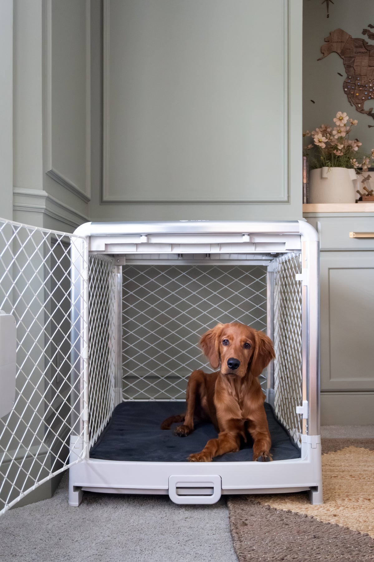 Our first crate, Revol, was created to address the myriad issues Zel encountered in his search for a dog crate for Louise. To address key safety issues with wire crates, Revol was designed with durable steel frame construction, rounded corners, a unique dual-latch door, and a unique, precise diamond mesh. Setup and storage was made a breeze with a unique collapsibility mechanism. Even to this day, Revol is still manufactured in factories alongside premium, ultra-safe baby products. On top of all that - it's not an eyesore at home like standard wire crates.